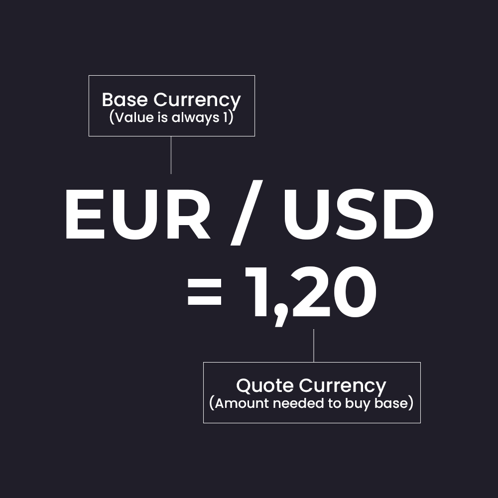 Each currency pair consists of a base currency and a quote currency. The base currency appears first and represents the currency being traded. The quote currency shows how much is required to buy one unit of the base currency. For example, when EUR/USD trades at 1.1000, one euro is worth 1.10 US dollars.